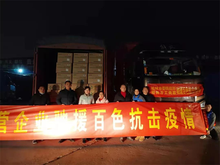 2月10日,桂林市委统战部、市工商联紧急召开会议,要求各负责人迅速与各捐赠单位做好对接、协调物流运输及物资接收等事宜。桂林党校年轻一代企业家培训班学员第一时间组织捐赠牛奶、泡面等物品各200箱。桂林米粉股份有限公司加班加点,以最快速度完成生产、打包、贴标、装车,“我们同时间赛跑,尽绵薄之力驰援百色!”当桂林市女企业家协会、桂林清研皓隆新材料有限公司、广西兴进实业集团有限责任公司等商会及企业的抗疫物资陆续到达对接点时,桂林市工商联主席林莉、党组成员姚爱良现场指挥并与工作人员一起装车。价值65.22万元的医用口罩、消毒液、消毒液生成器、桂林米粉等抗疫物资随车送达百色。