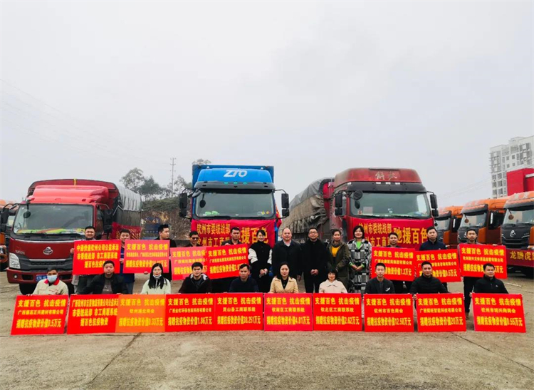 来宾市委统战部、市工商联组织商会和民企捐赠的价值38万元的防疫和生活物资于2月10日下午发车百色。