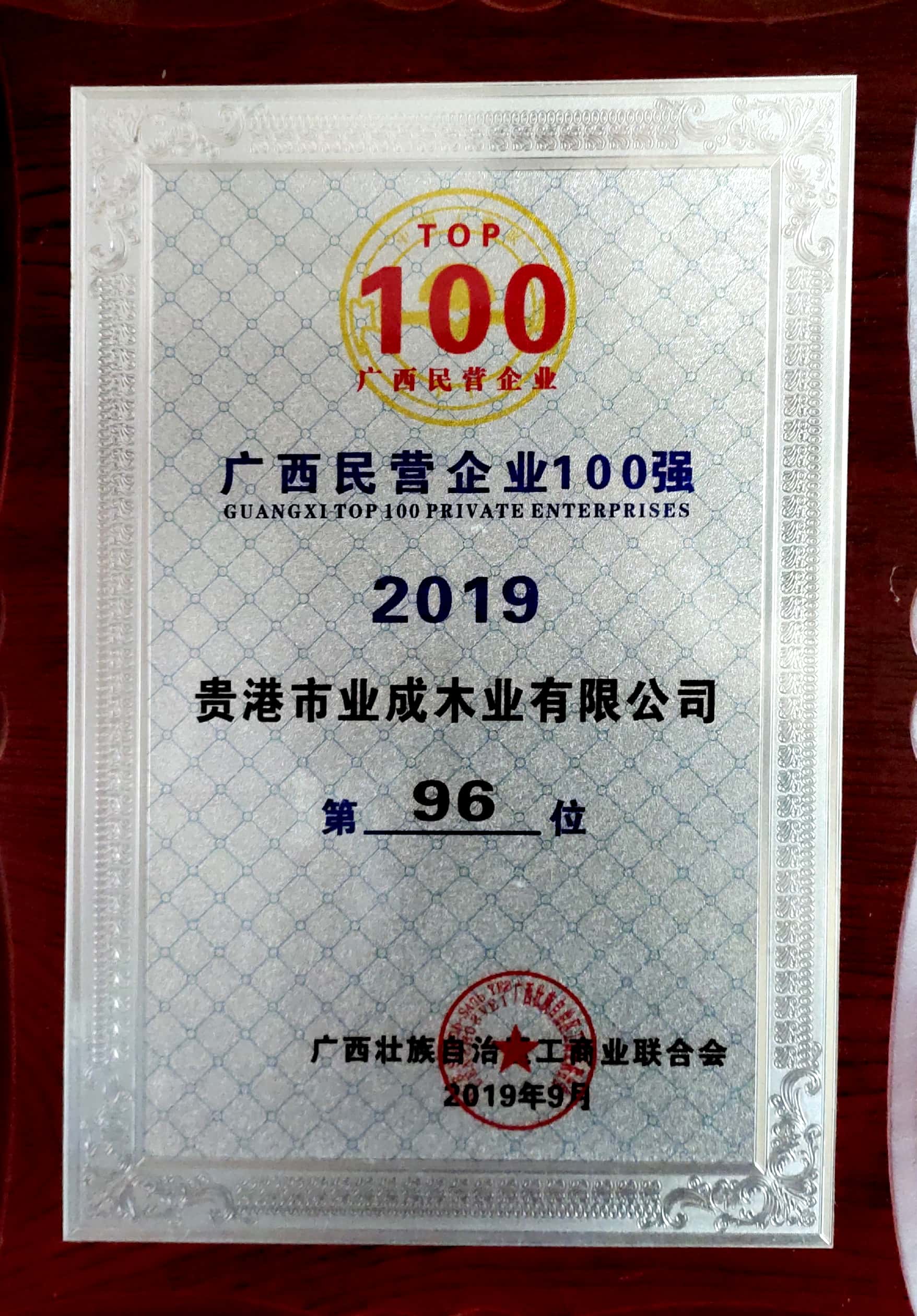业成集团目前为广西同行中产销量领先的民营企业,母公司贵港市业成木业有限公司业绩领先:2015年12月通过了ISO9001国际质量认证;2017入围全国工商联上规模民营企业,2017~2019年获得自治区农业产业化龙头企业;2017~2019连续三年进入广西“百强民营企业”行列;目前是贵港市港南区林业产业行业协会会长单位。